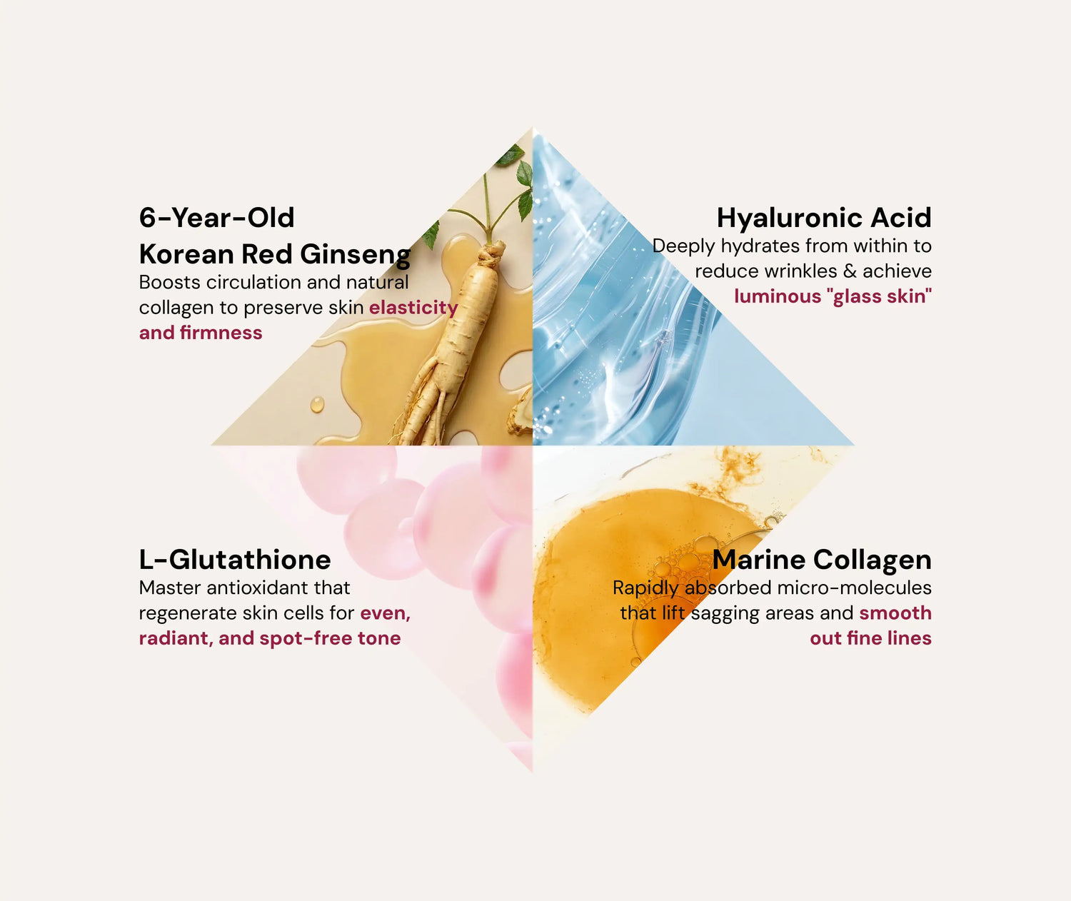 Our 4 miracle ingredients is unmatched in the industry and is purposely formulated to maximize benefits for glowing glass skin.