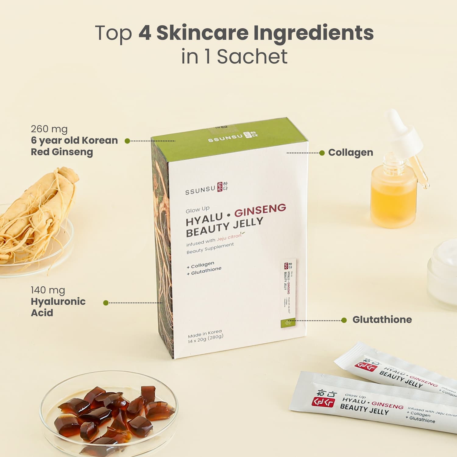 260mg, which is the daily recommended intake for antioxidant and skin health, as stipulated by the Korean Ministry of Food and Drug Safety (MFDS). Clinical studies show that Korean Red Ginseng increases blood circulation to preserves skin’s elasticity while stimulating natural collagen synthesis.